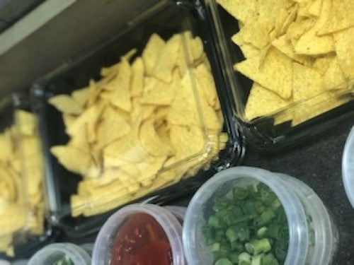 Nachokit, bestaande uit portie nacho, dipsaus, gemalen kaas, zure room, pijpajuin. Nog zelf te verwarmen. Werkwijze :